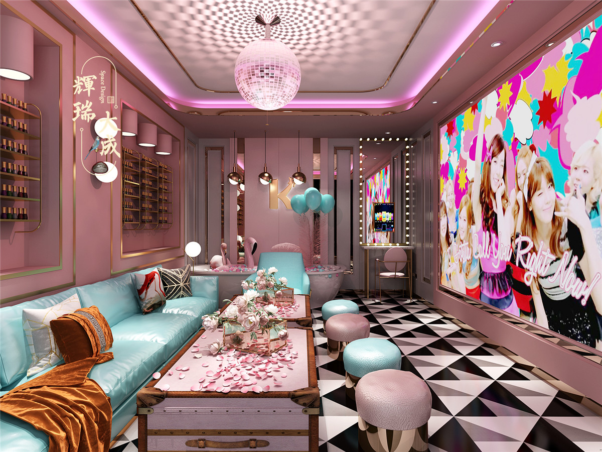 粉色系的網(wǎng)紅包房溫馨可愛,吊頂懸掛玻璃球,在燈光映襯下投射到墻壁上各種圖案,打造夢幻的氛圍。